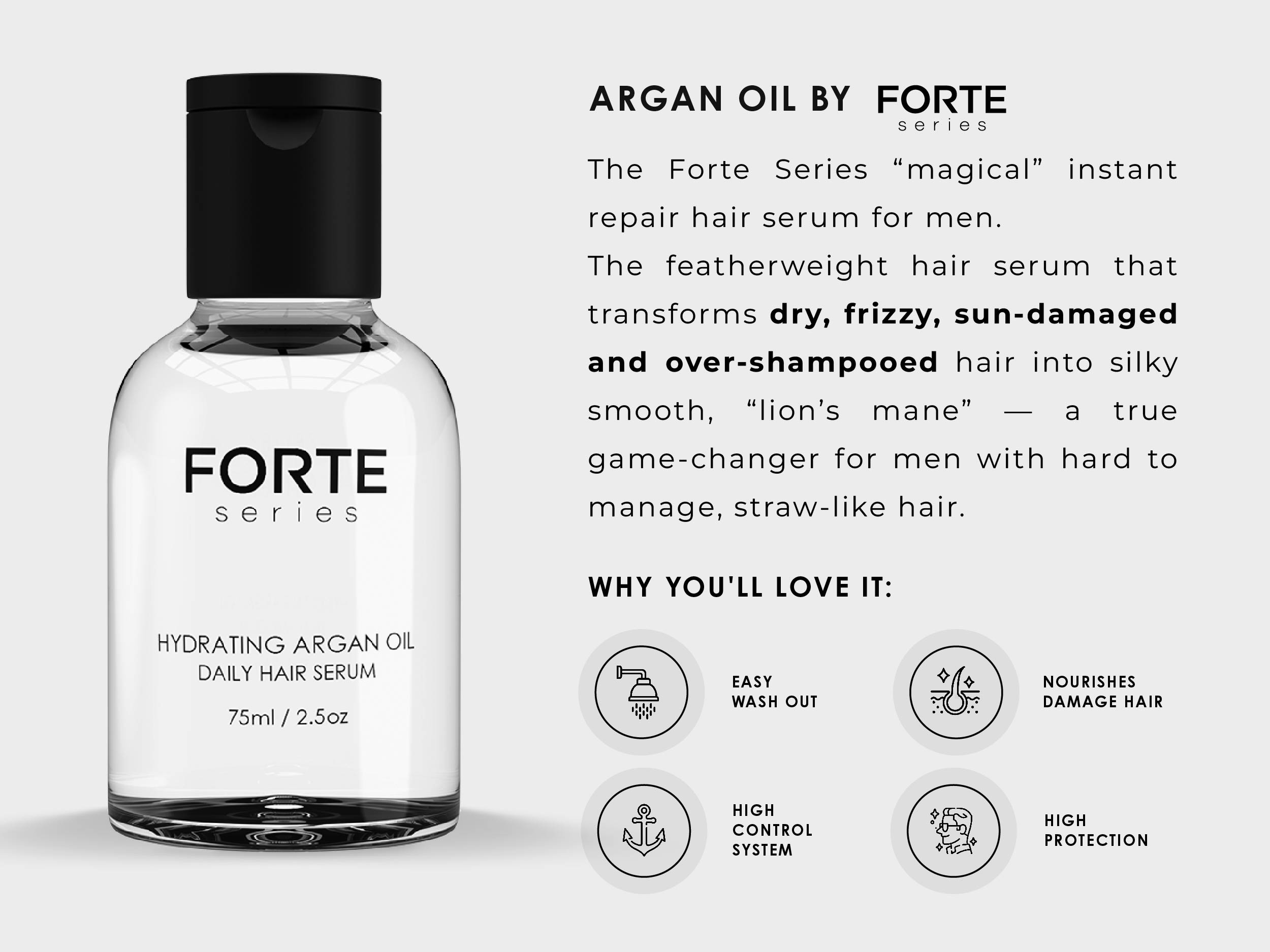 Our products are formulated by individuals who truly care about hair. Typical drugstore products are mass-produced by large corporations, leading to poor-quality products with cheap ingredients. Forte Series products are designed, formulated, and manufactured in the USA. A bottle of Forte Series Hydrating Argan Oil, when used as recommended, can last up to 3 months for medium-length hair. This product is best suited for men looking to revive and repair dry, damaged hair, and achieve a smooth, frizz-free hairstyle.