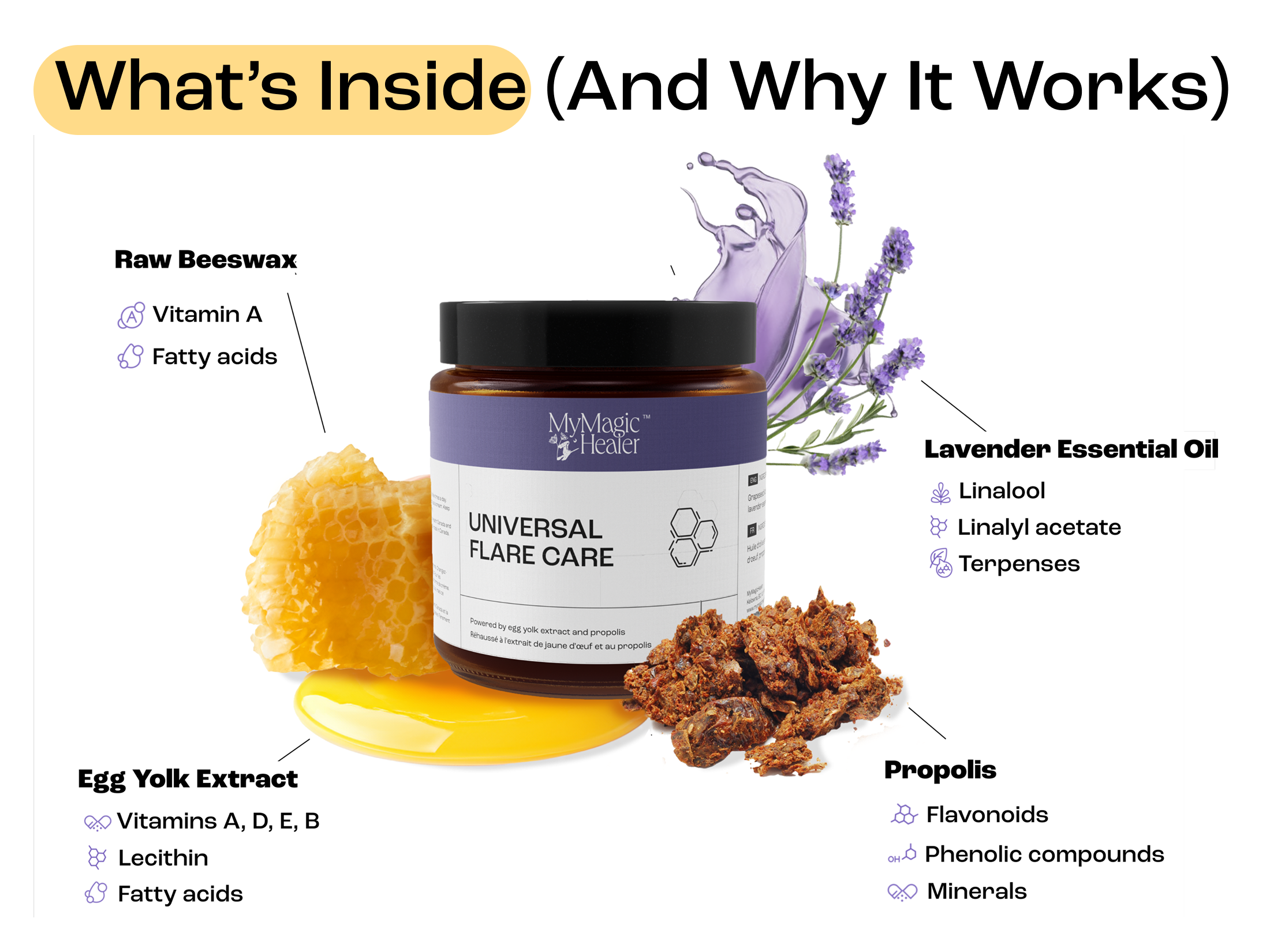 • Powered by egg yolk extract & propolis: Targets flare-ups, accelerates healing.
