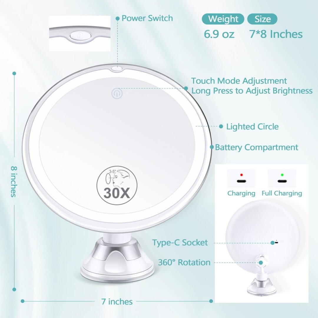 - Rechargeable Mirror: 30X magnification for flawless makeup application.