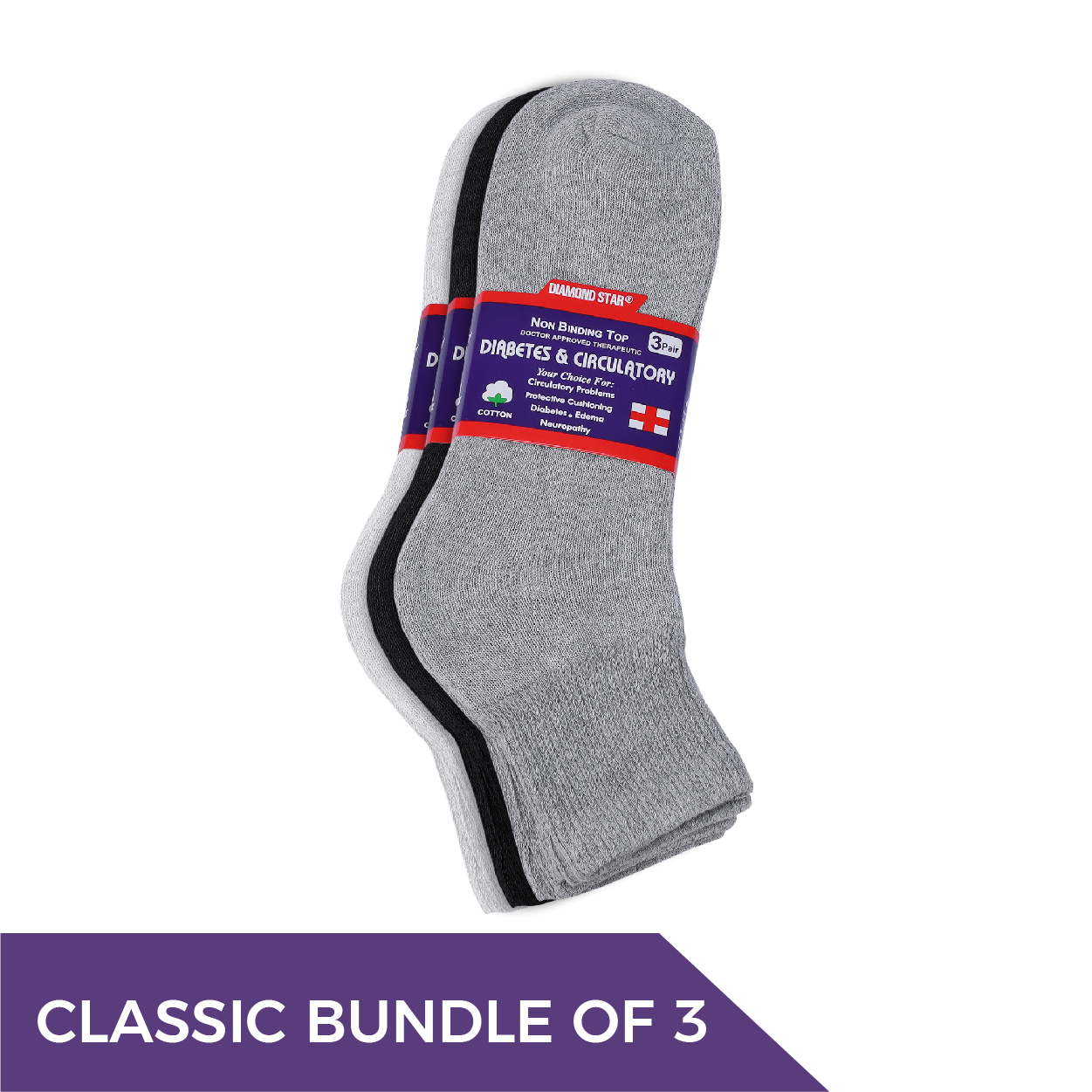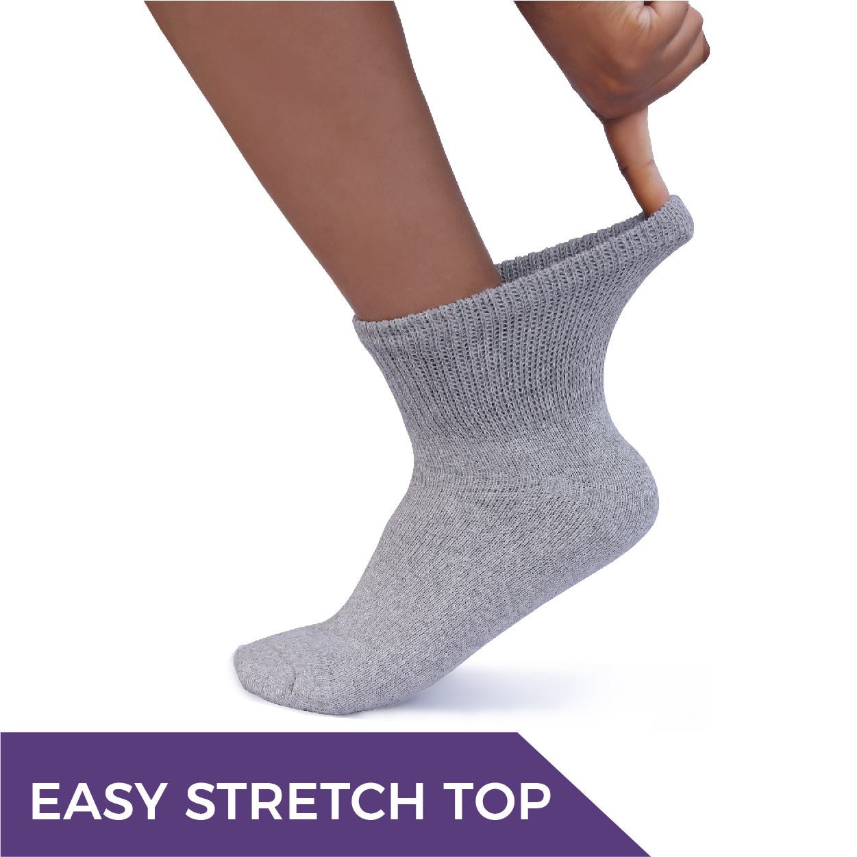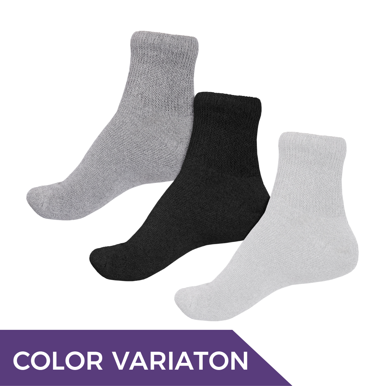 Diabetic ankle socks with non-binding tops and seamless toes, designed for comfort and circulation support. Available in various colors. Non-elastic design promotes circulation and comfort for individuals with diabetes. Made from soft, breathable cotton to keep feet dry and comfortable. Ideal for therapeutic benefits and everyday comfort. Sold in 3, 6, or 12-pair packs.