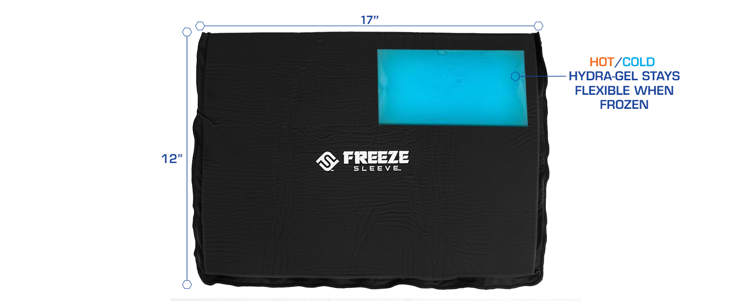 Store in the freezer for a minimum of 2 hours. Product may be left in the freezer indefinitely until ready to use. It will remain flexible when frozen. Remove the product prior to defrosting the freezer. Cold therapy will last 15-20 minutes. How do I use my FreezeSleeve for Hot Therapy? To heat, remove your Freeze Sleeve from the storage bag. Microwave for 30 seconds, then hold your Freeze Sleeve firmly against the skin, it should feel warm to the touch not HOT. Reheat in 10 second increments until desired temperature is reached. Where should I store my FreezeSleeve? Always store your Freeze Sleeve in the provided resealable & recyclable bag. Keep the unit in the sealed bag when storing in the freezer or anytime it is not being used. Your Freeze Sleeve will stay flexible when frozen. What if I am between sizes? If you are between sizes, it is recommended that you order the larger size to ensure proper fit. How do you clean FreezeSleeve? To clean, use a damp cloth to mildly rub the outer layer of fabric. Allow FreezeSleeve to completely air dry before putting it back into the freezer. Do not get your Freeze Sleeve wet.
