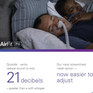 The ResMed AirFit P10 is designed to provide quiet comfort, stability, and easy adjustability. A prescription is required for the complete CPAP system