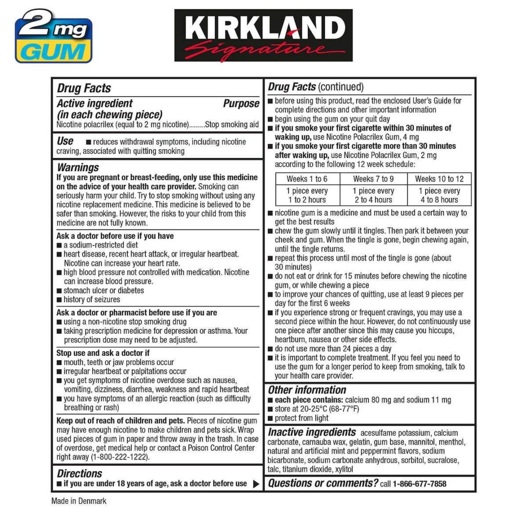 Kirkland Signature Ice Mint Flavor Coated Nicotine Polacrilex Gum is a Nicotine Replacement Therapy product designed to help you quit smoking. Coated for intense flavor and sugar-free, it aids in controlling nicotine cravings and gradually reducing dependency. Independent lab tests confirm its similarity to Nicorette White Ice Mint Gum.
