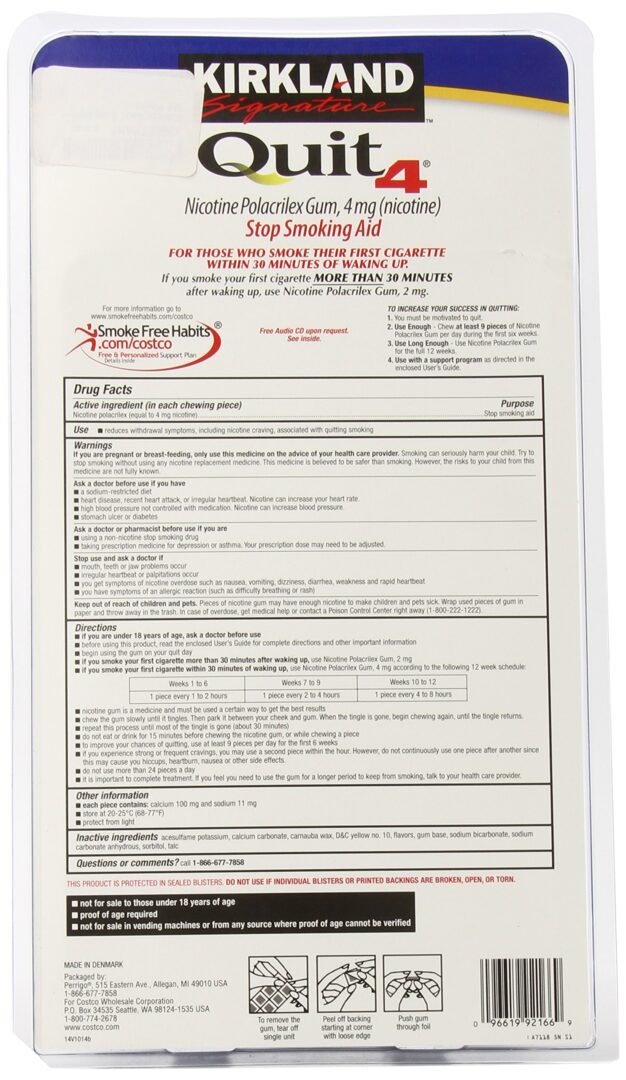 For smokers who have their first cigarette within 30 minutes of waking up, Kirkland Signature Quit Smoking Nicotine Gum in the original flavor provides a 4 mg option. Compare to Nicorette active ingredient.