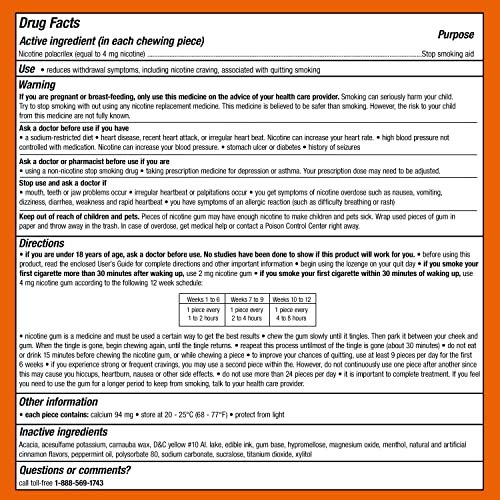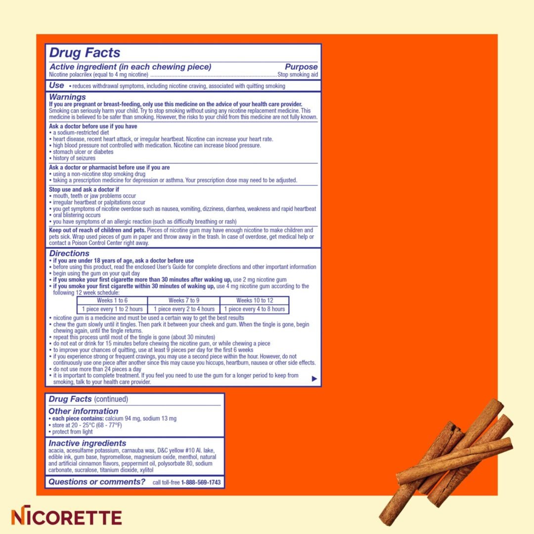 Nicorette 4 mg Nicotine Gum Stop Smoking Aid helps control nicotine intake while enjoying chewing to aid quitting. Made with a special formula to kick the smoking habit gradually, releasing therapeutic nicotine doses to manage cravings, anxiety, and restlessness. This double coated gum offers long-lasting Cinnamon Surge flavor to stick with quit goals, with guidance for optimum usage. FDA approved and effective to support smoking cessation.