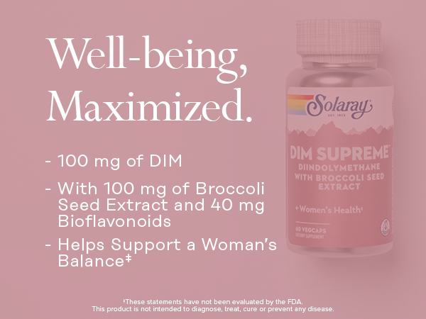 DIM, or diindolylmethane, is a compound naturally found in broccoli, brussel sprouts and other cruciferous vegetables. A DIM supplement is thought to help support a woman’s balance during all stages of the aging process. Who benefits most from taking a DIM Supreme supplement? Especially formulated with women in mind, Solaray DIM Supreme is also an excellent DIM supplement for men. What doses of DIM and other compounds does Solaray DIM Supreme provide? DIM Supreme provides 100 mg of DIM and 100 mg of broccoli seed extract for additional support. This hardworking complex also supplies 40 mg of antioxidant-containing bioflavonoids for overall wellness support.
