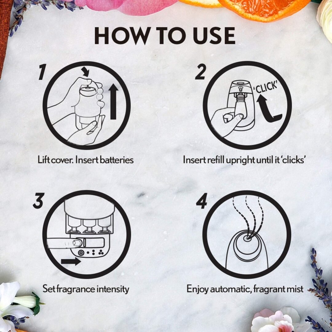 Discover premium fragrances infused with natural essential oils diffused by mist with Air Wick Essential Mist diffuser. Transform your home with gentle mist surrounded by various scents like Lavender, Almond Blossom, Fresh Water Breeze, and more. The cordless, portable design enhances functionality and sustainability by reducing plastic usage. Adjust the mist intensity for a perfectly fragranced room.