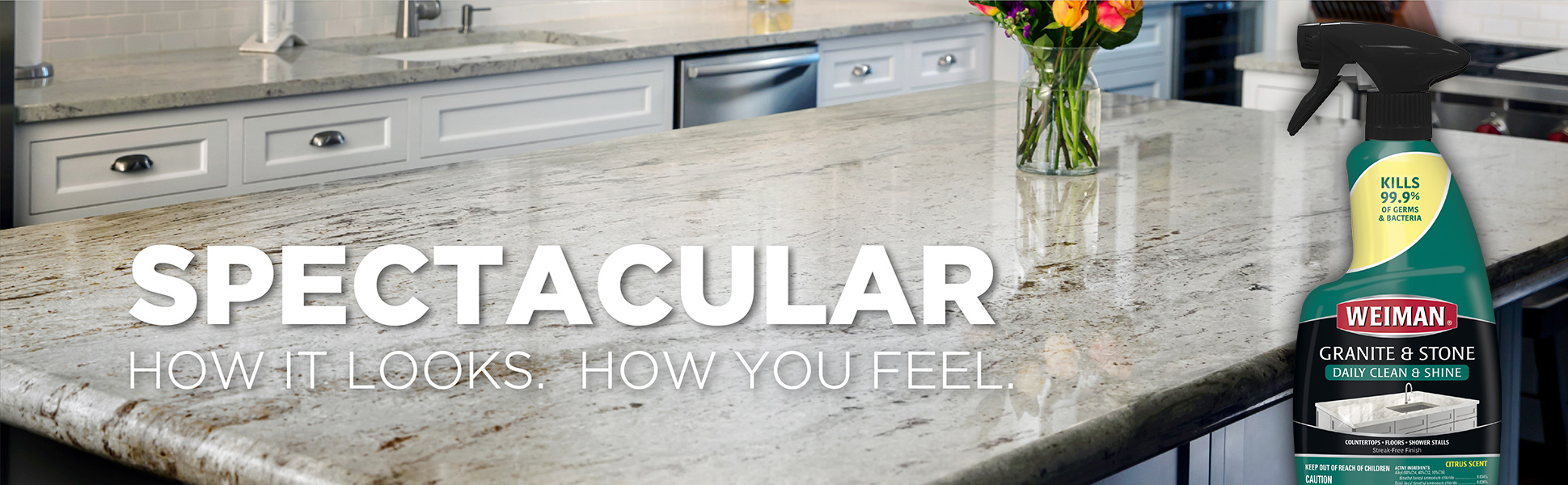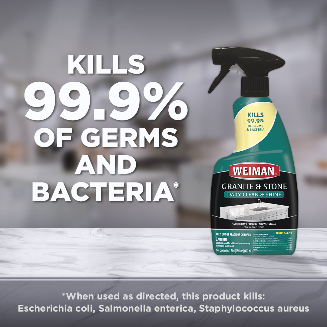 Reveal the natural beauty of stone surfaces in your home with the Weiman Granite & Stone Daily Clean & Shine Trigger Spray. Our new disinfecting formula kills 99.9% of germs & bacteria. Instantly revitalize & disinfect your stone surfaces with Weiman Granite & Stone Daily Clean & Shine with disinfectant Trigger Spray. Its superior formula works well on countertops, floors, shower stalls, kitchen sinks, bathroom sinks, tubs, floors & other hard, non-porous surfaces. Cleans, shines, deodorizes and disinfects all hard, non-porous surfaces. For use on sealed granite, sealed marble, sealed limestone, sealed slate, glazed tile. For use in kitchens, bathrooms and other household areas. Kills the following bacteria in 10 minutes on hard, non-porous surfaces: Escherichia Coli (E. coli), Salmonella Enterica (Salmonella), and Staphylococcus Aureus (Staph). Kills the following viruses in 10 minutes on hard, non-porous surfaces: Influenza A (H1N1). Effortlessly lift dirt, soil, grease and grime to reveal the beauty of your brand-new surfaces or revitalize your old stone surfaces. Reveal the original brilliance of your natural stone surfaces & make Weiman an essential for everyday treatment. Weiman wants each of the surfaces in your home to look its best. That’s why we have developed cleaning products that go beyond simply cleaning to beautify and protect each of your delicate, difficult to care for surfaces. From stainless steel to leather to granite, each of our products is formulated specifically for one surface and one surface only; allowing you to achieve the perfect results that your home deserves. A clean home is great, but we want it to look more than clean, we want it to look spectacular! Weiman leaves a shine and acts as a protector where other cleaners do not compare.