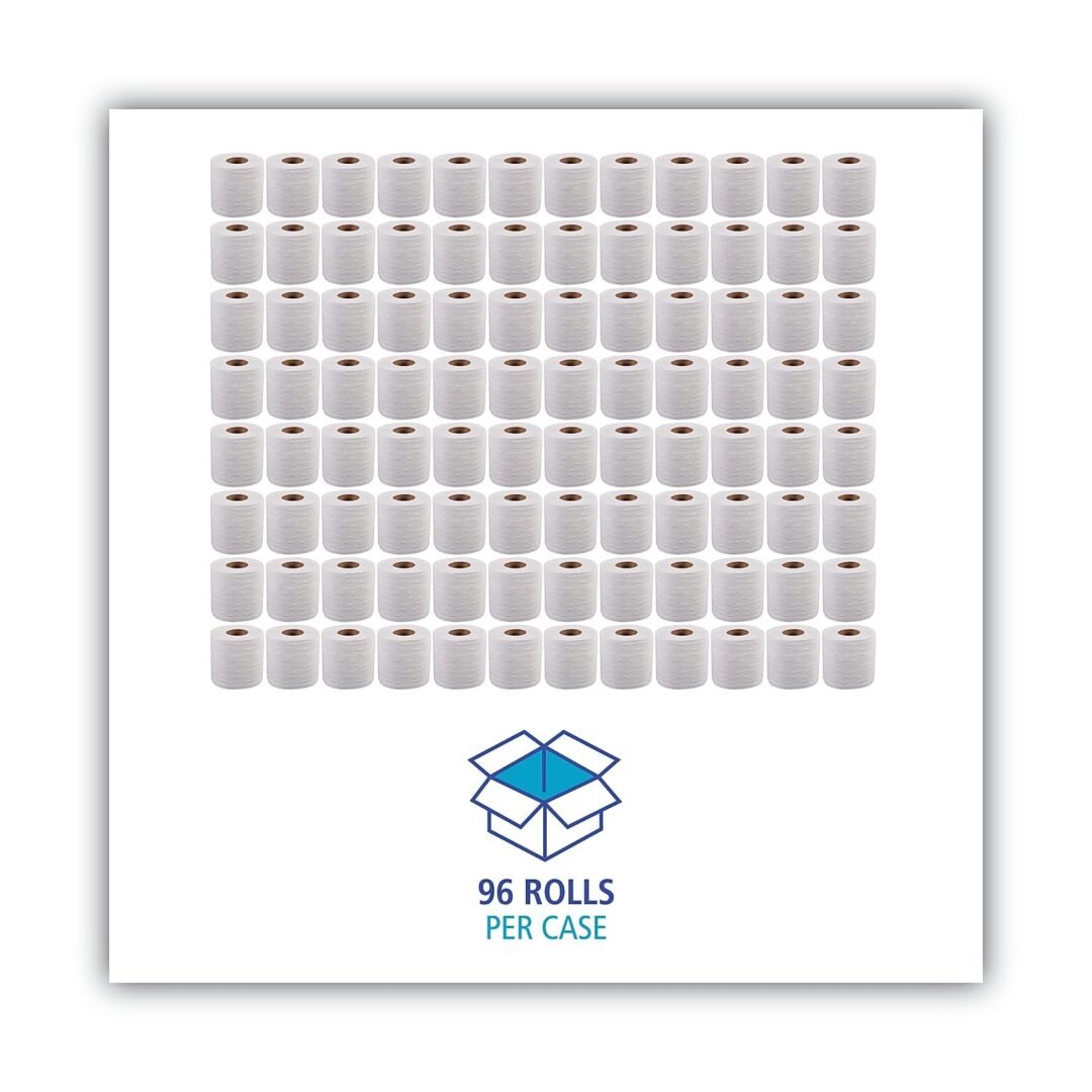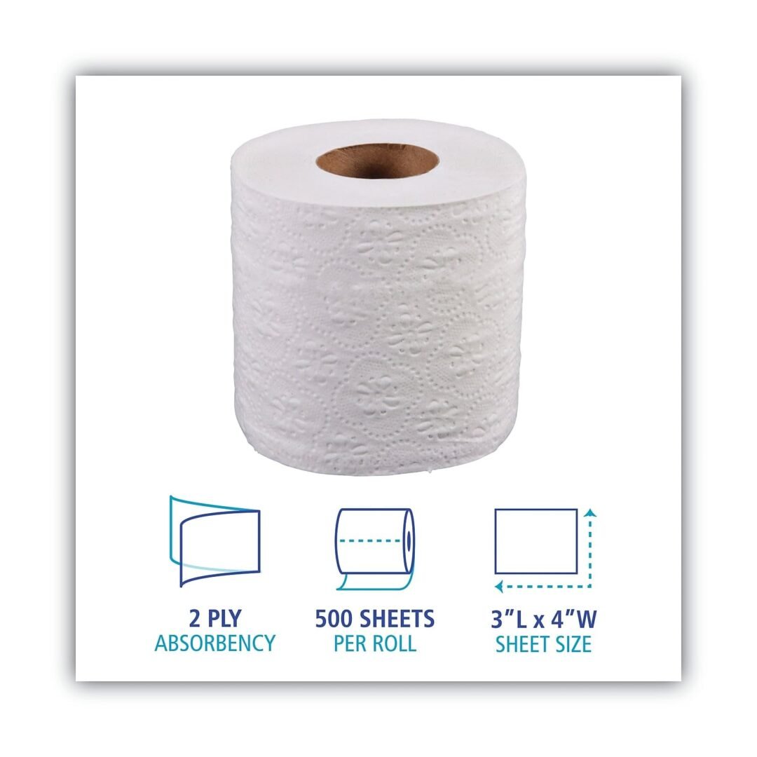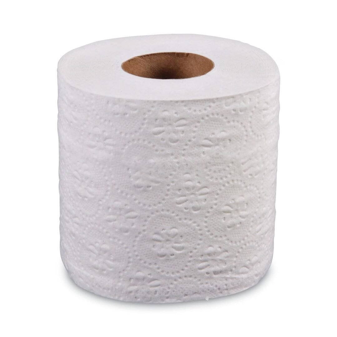 Quality, durable toilet tissue that is soft and absorbent, available at an economical price. Two-ply, durable, embossed white tissue on a standard size roll. Individually wrapped for maximum cleanliness and safety. Ideal for industrial, office, restaurant, or retail bathrooms. Fits standard toilet-roll holders or dispensers.