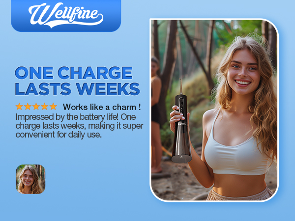 Stay powered and protected with Wellfine’s water dental flosser, featuring extended battery life and IPX7 waterproof rating, perfect for on-the-go use and shower convenience, ensuring lasting performance wherever you go.