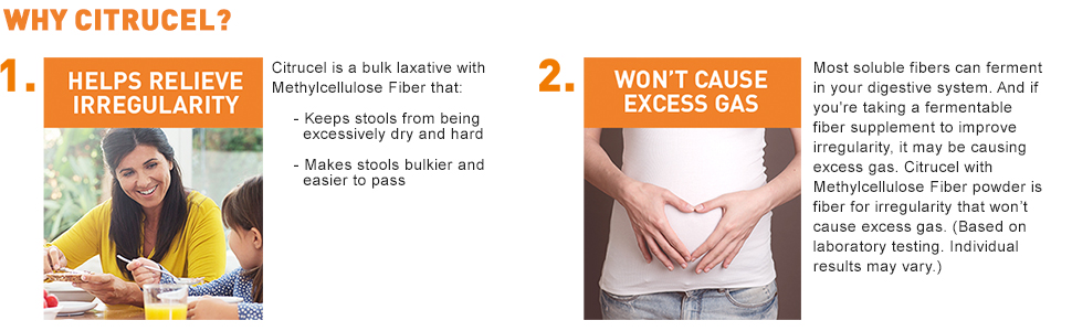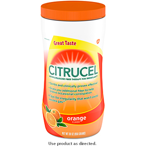 Clinically proven effective to relieve occasional constipation, Citrucel contains methylcellulose fiber, which is non-toxic and non-allergenic. The orange flavor adds a great taste to this fiber supplement. Recommended by physicians among therapeutic fiber laxatives, Citrucel is available in two sizes and is a reliable choice for constipation relief.
