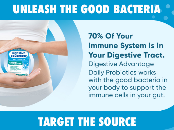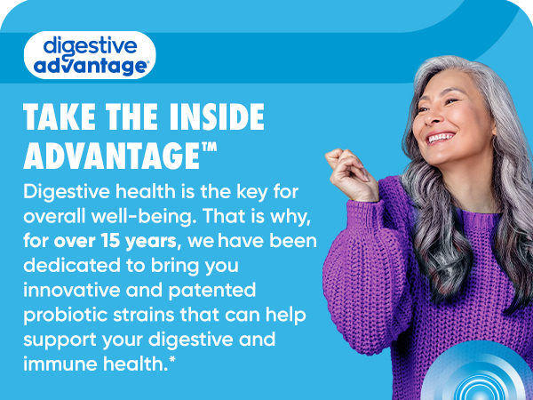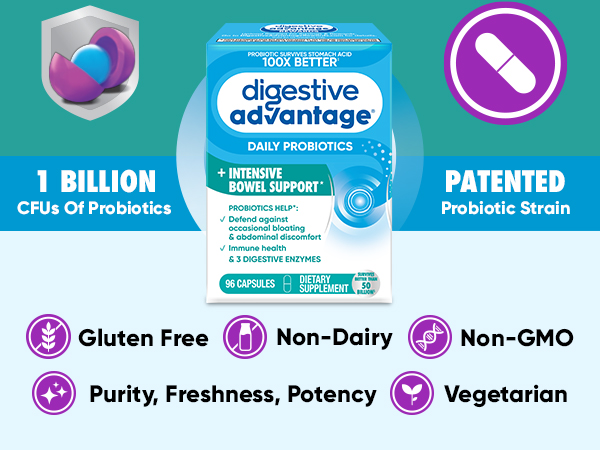 Digestive Advantage Intensive Bowel Support Probiotics is the complete solution for digestive health. It restores the natural balance of good bacteria in your intestines, defending against occasional gas, bloating, and abdominal discomfort. This once-daily probiotic contains a patented probiotic, BC30, protected by a protein shell. This unique feature allows it to survive the harsh conditions of your stomach and reach the intestines, promoting long-term digestive and immune health. Studies show that BC30 probiotics and digestive enzymes break down proteins, carbohydrates, and fats, aiding the digestive process.