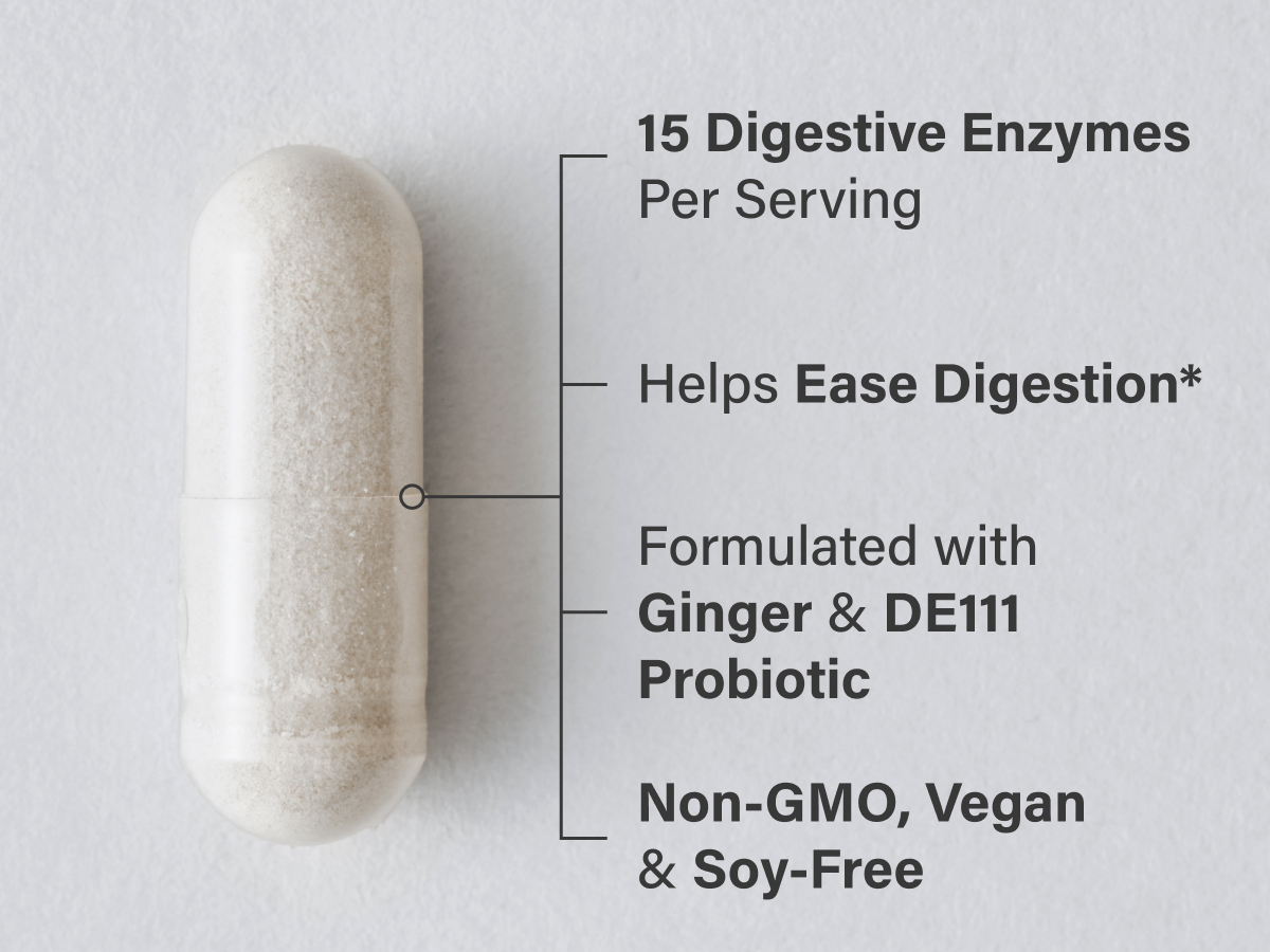 Our formula combines 15 enzymes with ginger and DE111 (a clinically proven Bacillus subtilis probiotic) to aid in breaking down proteins, fats, carbs, sugar, fruit fiber, vegetable fiber, and dairy.