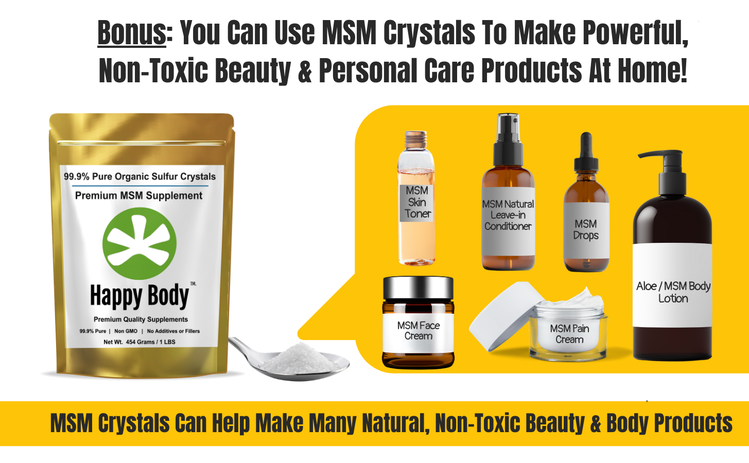 Enhance beauty & wellness with our pure MSM crystals, for natural homemade care products like Face Masks, MSM Creams, Leave-In Conditioners, Liquid MSM Drops, and Aloe-Infused Lotions.