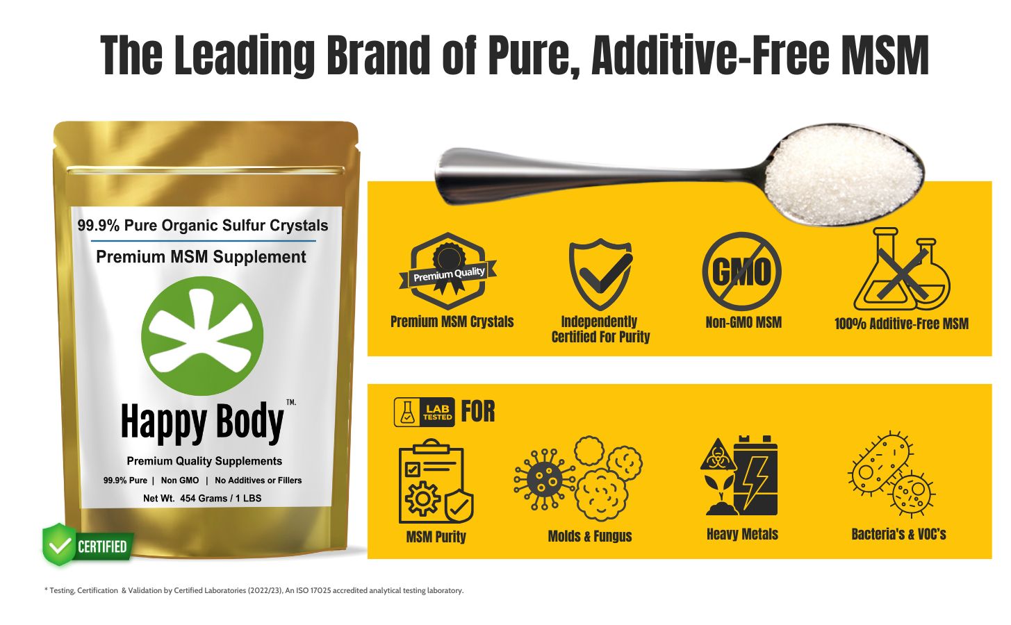 Each batch of Happy Body Organic Sulfur is made to our exacting standards, tested for MSM Purity, Heavy Metals, VOC’s, Molds & Bacteria. Our MSM is certified 100% additive-free and high-dose. Naturally Gluten-Free, Dairy-Free, GMO-Free, & Vegan Friendly.